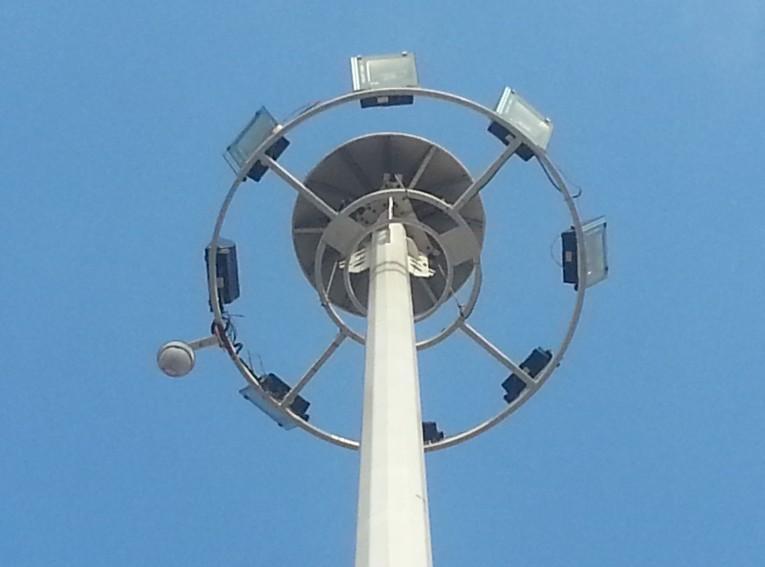 高杆灯按其样式可分为固定式、倾倒式、升降式,其中高杆灯常见的为升降式。升降式高杆灯设手动和电动两种升降控制方式,使灯盘安全可靠地降到离地面2.5米处,方便维护工作。手动遥控装置引出线的长度为10米,操作人员在5米处遥控灯盘的升降,这样可确保操作人员的人身安全。升降式高杆灯还配备一段备用电缆,当灯盘降至最低位置时,该电缆一端插入电气控制系统的插座内,另一端插入灯盘上的接线盒内,如此就能对灯盘直接供电,检修灯具。升降式30米的高杆灯正常的配置是3节,每节高杆灯的厚度分别是6mm、8mm、10mm。在这里,海光照明特别提醒到:在风力比较大的地方,为了加固高杆灯的安全稳定性,可加厚高杆灯的配置为8mm、10mm、12mm。