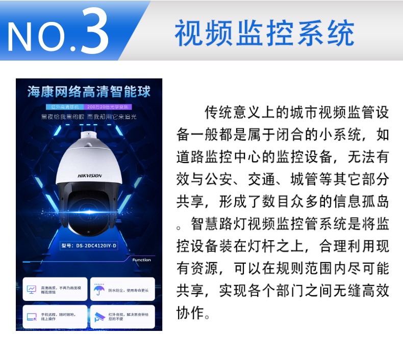 智慧路灯是依托智慧灯杆和LED路灯,集成WIFI基站、摄像头、红外线传感器、雷达、电子显示屏、充电桩、环境监测传感器等,变成一个信息载体,实现数据监控、环保监测、车辆监控、安防监控、